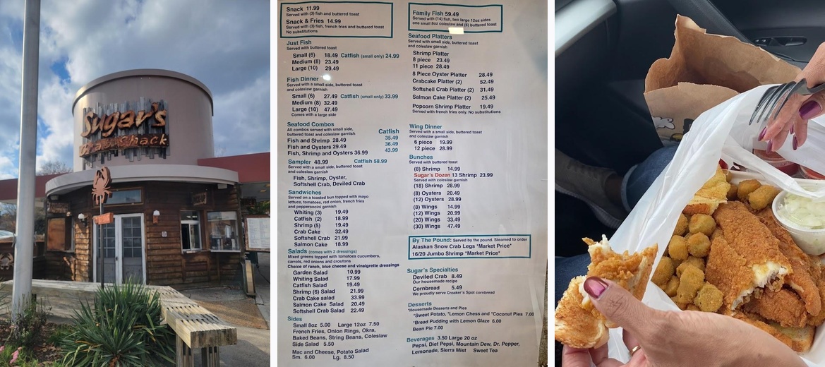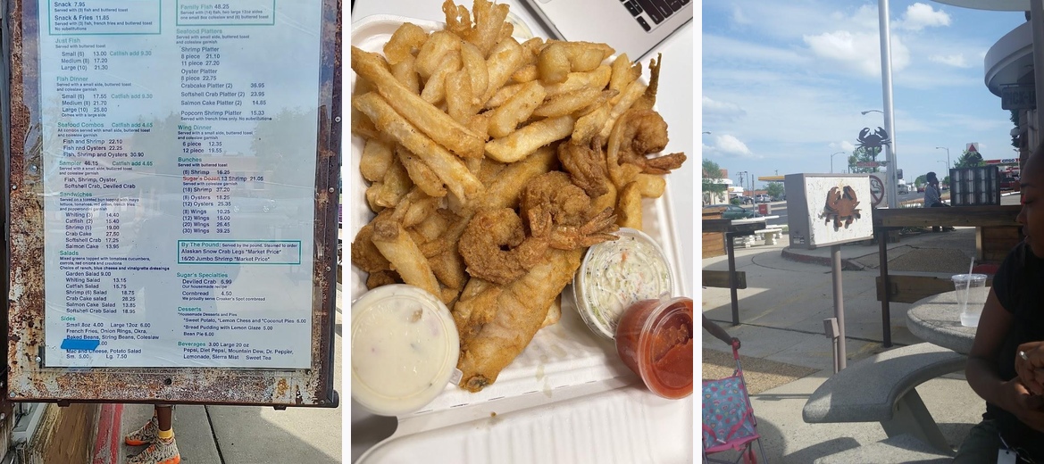 The fish was excellent — fresh, well seasoned, and the fries were fried but crisp not greasy — topped off with bean pie for desert, atmosphere was culturally welcome with good old school music— and the service, well it felt like being home— kindness and smiles and they even showed us the food before we took it back to our outside table and just ate, laughed and enjoyed the beauty of the moment. Thanks for making our date night special. We WILL be back. The owner even stopped by our table to see how our meal was and let me say Sugar’s is a real blessing — 🙏🏽❤️❤️